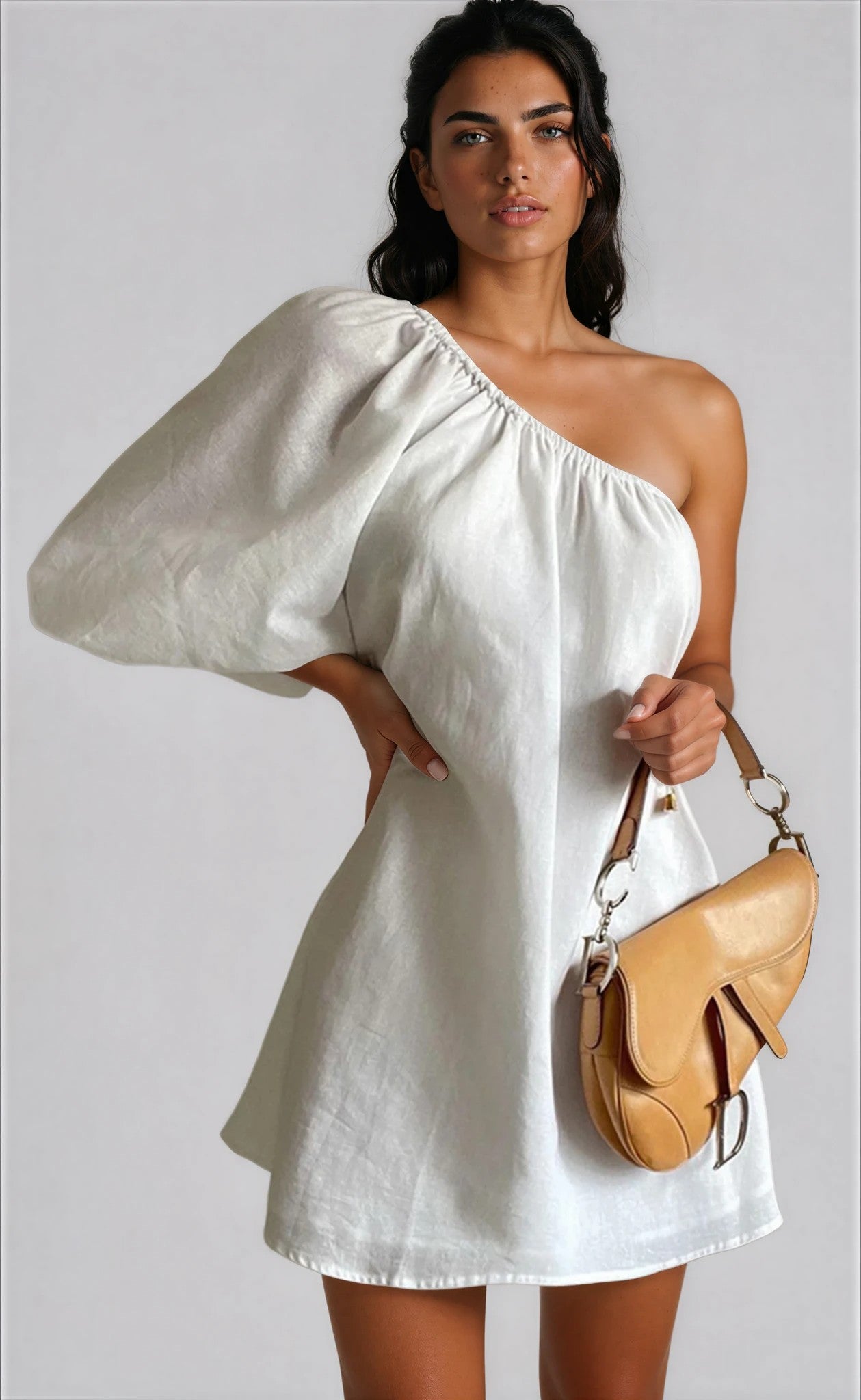An effortlessly refined one shoulder dress designed with modern simplicity in mind. The asymmetric neckline is balanced by a softly voluminous sleeve, creating an elegant silhouette that highlights the collarbone and shoulders. The gently tailored shape falls into a clean, flattering mini length for a look that feels both relaxed and polished.