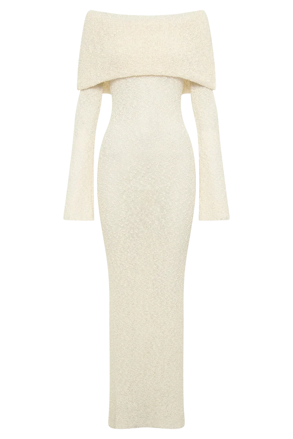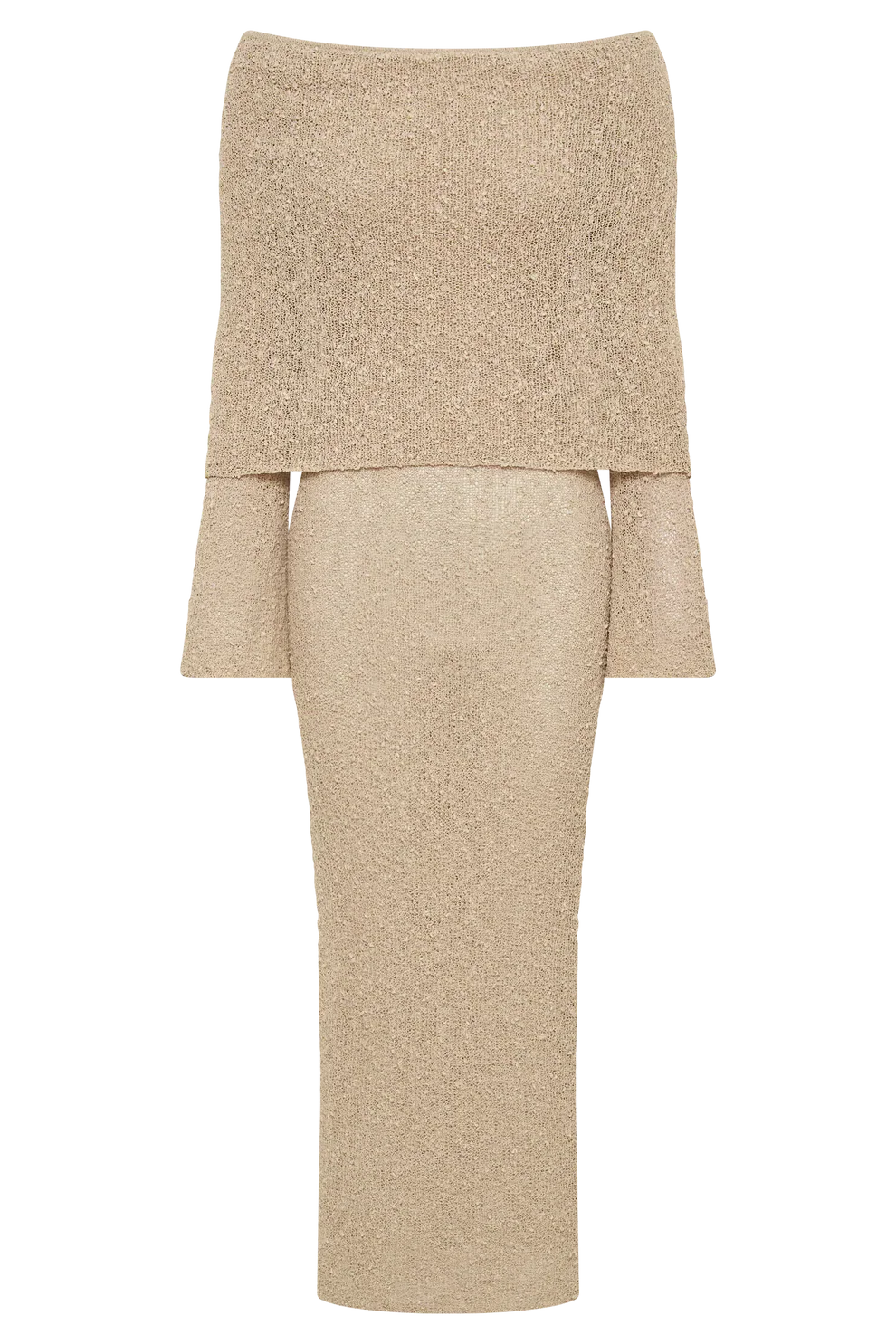 A softly textured two-piece set crafted in a warm neutral shade, designed to bring effortless elegance to everyday dressing. The off-shoulder top drapes gently across the neckline, with long sleeves that add balance to the relaxed silhouette.