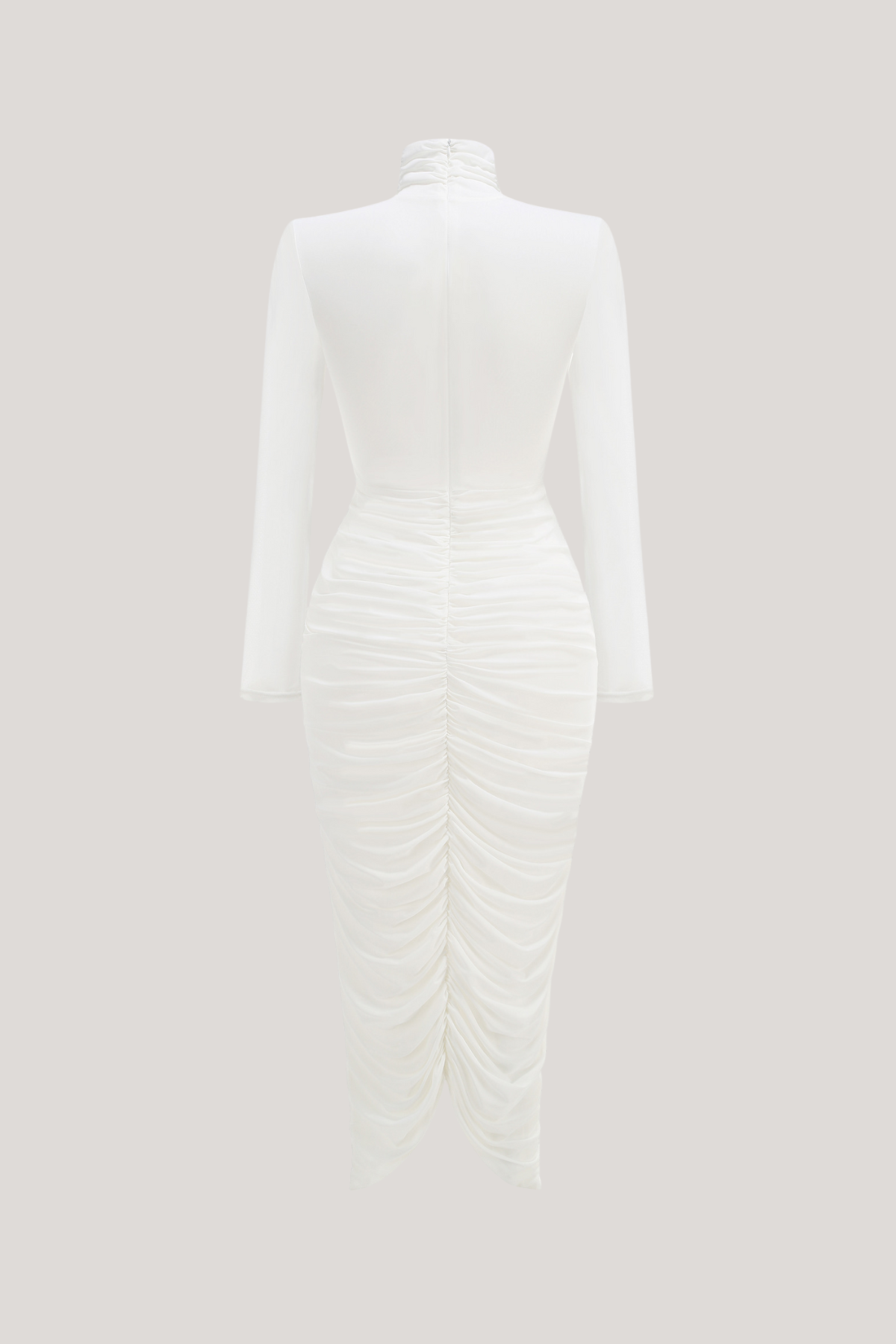 A refined midi dress defined by clean tailoring and a contemporary silhouette. The elevated neckline creates an elegant frame, while carefully placed ruching through the bodice adds flattering structure and subtle visual interest.