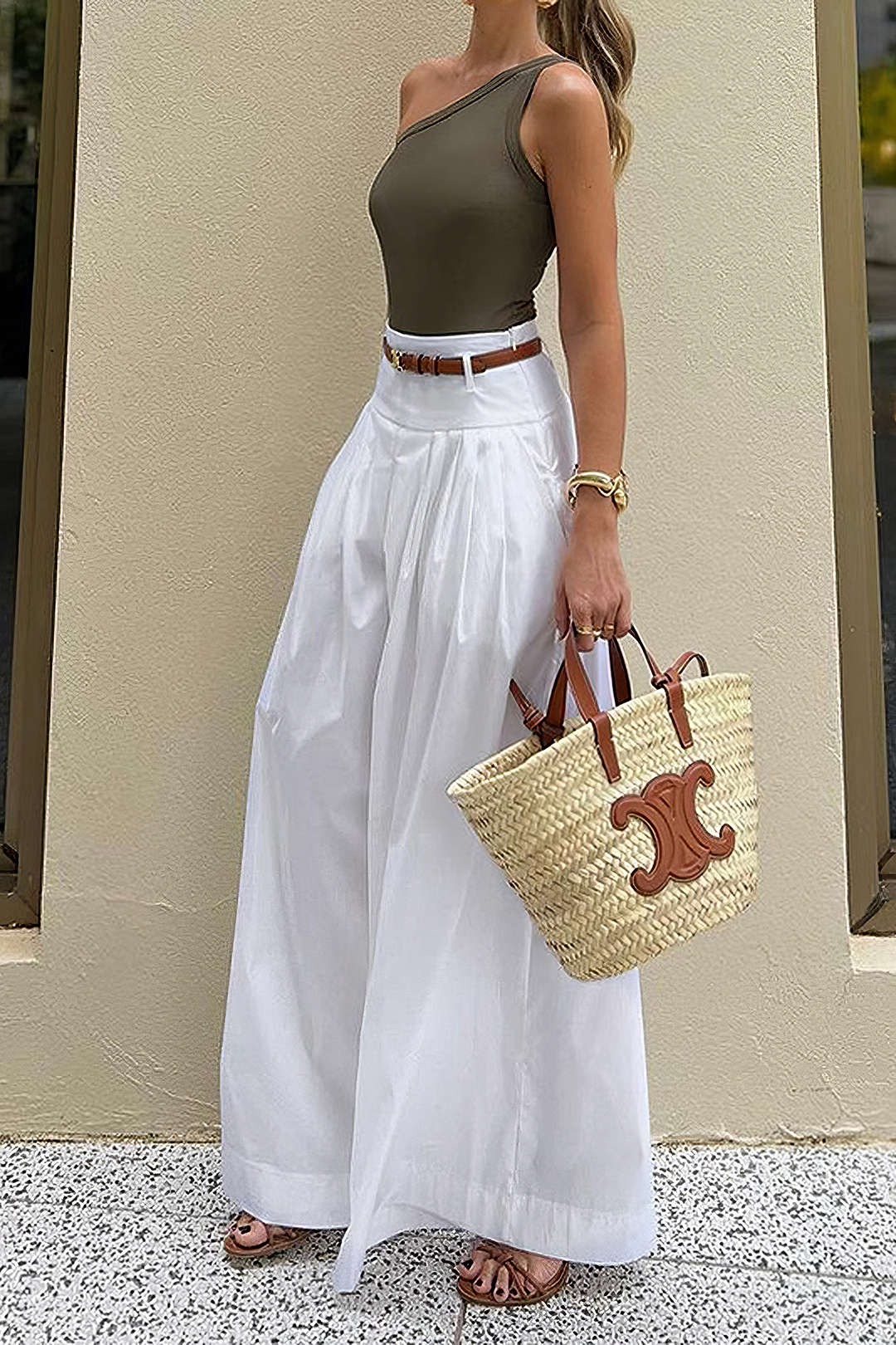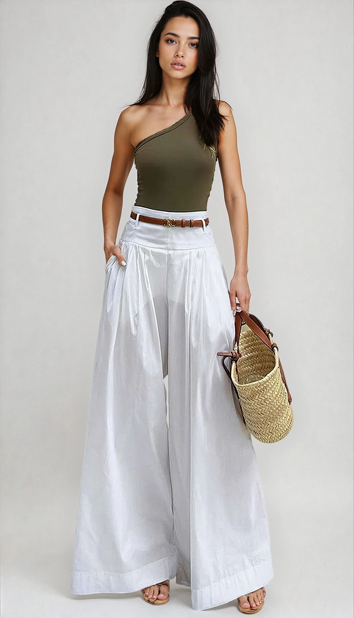 A refined take on women’s fashion, these high-waist wide-leg trousers are designed for a flattering silhouette with effortless movement. The lightweight, airy fabric drapes softly for an elegant yet comfortable feel, suited to warm days and relaxed evenings alike.