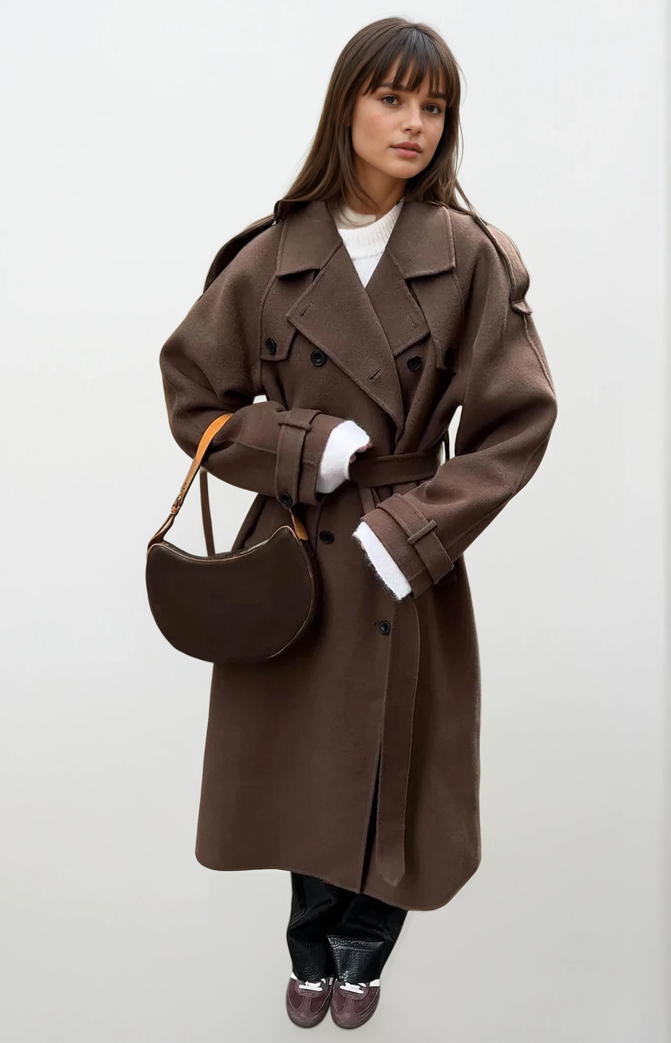 The Wool‑Blend Trench Coat presents a structured yet relaxed layer for cooler seasons. Designed with a double‑breasted front, strong lapels, and a self‑tie belt to accentuate the waist, it is crafted from a rich wool-blend fabric for a refined appearance. Its timeless silhouette works seamlessly over chunky knits or casual separates.